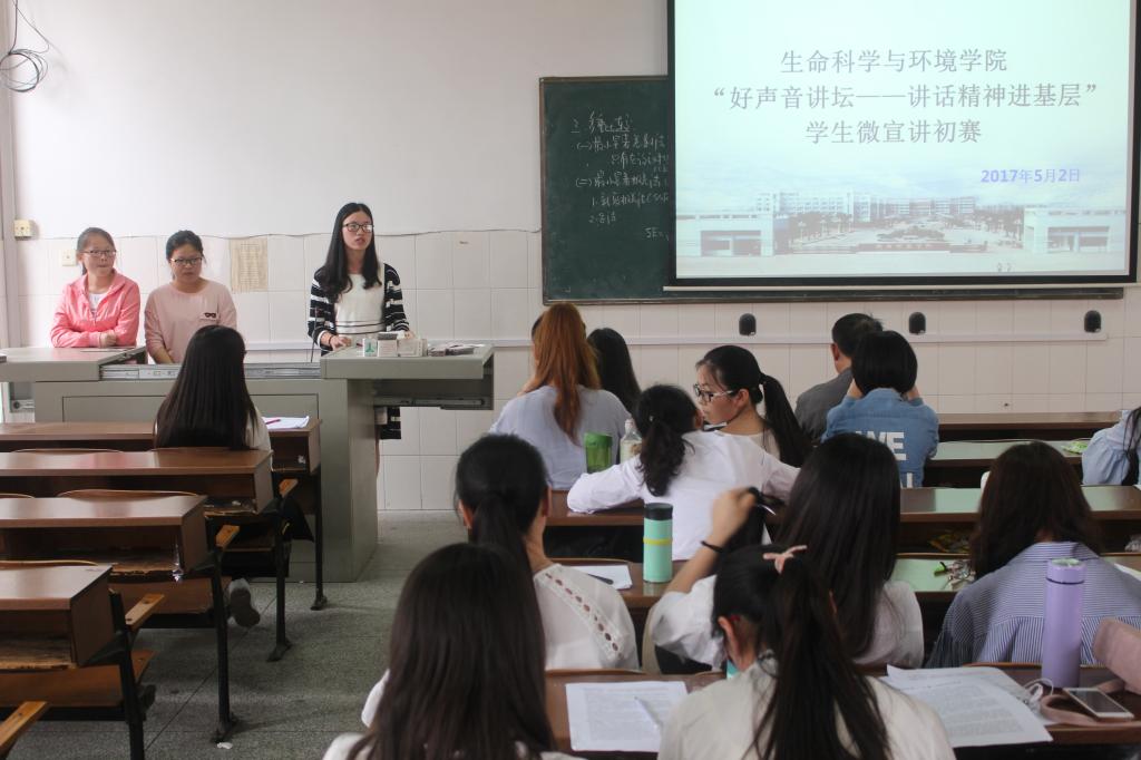 5月11日晚19时,“好声音讲堂-讲话精神进基层”师生微宣讲比赛学生组决赛在东校区音乐厅举行。生命科学与环境学院3支代表队结合自身学习和生活实际,用富有感染力的表达、鲜活真实的事例和充满激情的语言,从不同角度诠释对“习近平总书记系列重要讲话精神”的深刻理解,赢得了观众的热烈掌声。经过激烈地角逐,beat365官网15级生物科学1班荣获三等奖,15级生物科学2班、15级环境工程1班荣获优胜奖。