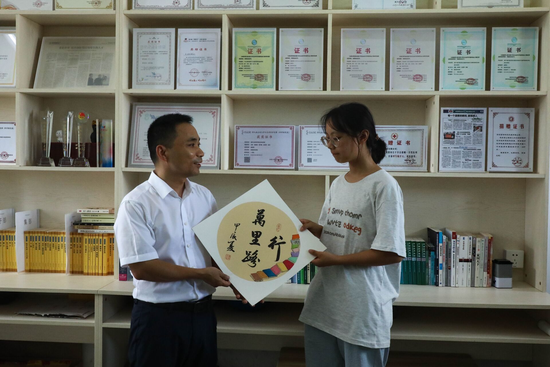 “读万卷书”——这是唐教授对生物科学专业2402班新生代乐的寄语,他鼓励代乐同学在学习专业课程的同时也要学习思想文化、艺术科学等知识,以智慧武装自己的头脑、丰富自己的生活,读万卷书让自己成为一个全面发展的有志青年。代乐同学非常感谢唐教授送予的字画,表示在今后的校园生活中努力践行唐教授读万卷书的期望。