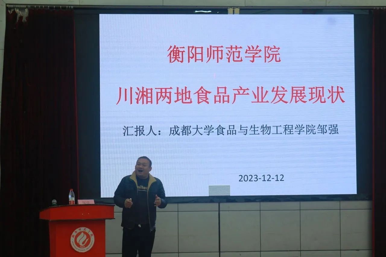 为了增强beat365官网师生对食品产业的了解,启发同学对食品专业的思考,beat365官网特邀成都大学食品系主任、副教授、邹强博士于12月12日上午10:00在beat365官网西校区模拟法庭进行了主题为川湘两地食品产业发展现状的学术沙龙活动。院长易诚、副院长陈晓华、学工办主任兼团委书记刘树芬等老师出席本次讲座,22级、23级部分同学参加。