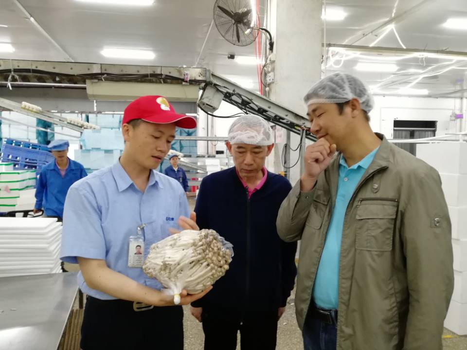 稍后,考察组一行先后到蘑菇生产厂房、菌株研发中心、生育实验室进行观摩学习。据许总介绍,实验室通过对光线和温度的调控,令蘑菇成熟时具有相近的大小和高度,而菌株的选择和保存是批量生产的关键一环。考察组还特别参观了真姬菇生产出菇车间,全面深入地了解了食用菌生产工艺流程。在此,双方就生产能力和产品质量安全进行了交流探讨,考察组一行深切地感受到了食用菌现代化生产技术的颠覆性变革以及当前教学改革的紧迫性。
