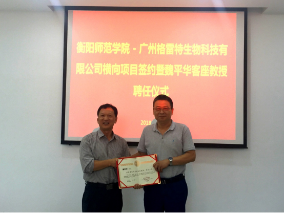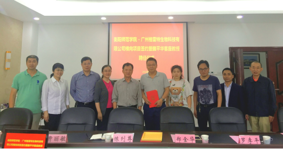2018年6月1日下午,beat365在线唯一官网与广州格雷特生物科技有限公司校企合作项目签约暨魏平华先生客座教授聘任仪式在东校区学术交流中心举行。广州格雷特生物科技有限公司董事长兼总经理魏平华先生、总经办主任练玲女士、研发部张抒女士,以及beat365官网副校长郑金华教授、人事处处长陈列尊、科技处处长罗李平、生命科学与环境学院党总支书记刘艳波、院长曹丽敏、副院长易诚、副院长杨海以及唐青海博士出席签约仪式,仪式由罗李平处长主持。