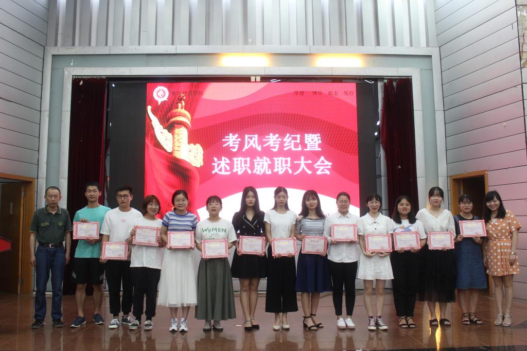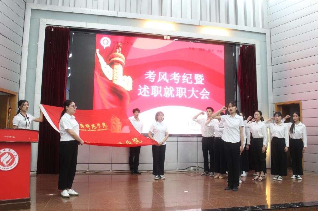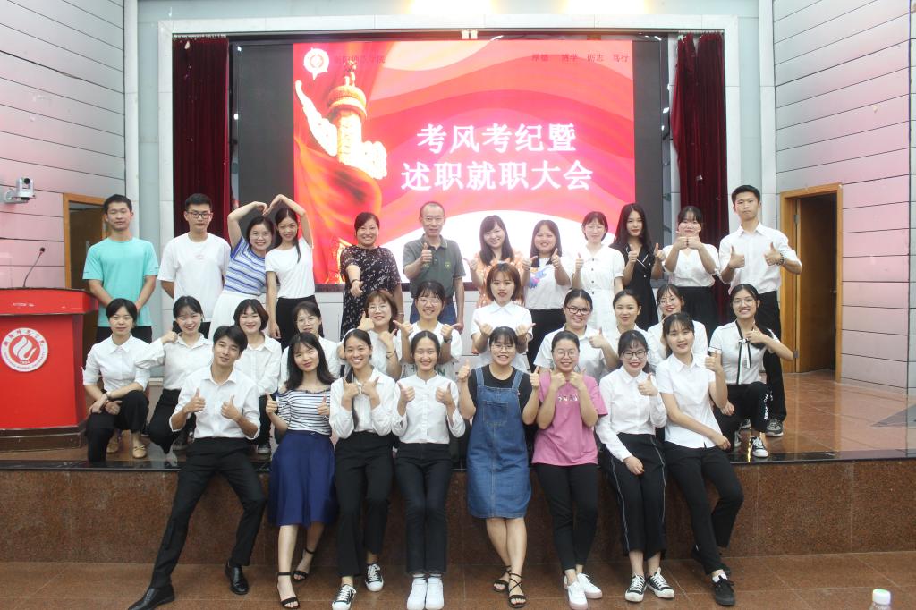 6月26日晚七点,beat365在线唯一官网生命科学与环境学院2019年上学期考风考纪暨学生干部述职就职大会在西校区模拟法庭顺利召开。党总支书记刘艳波,团委书记刘树芬,辅导员老师许若霏出席本次大会。