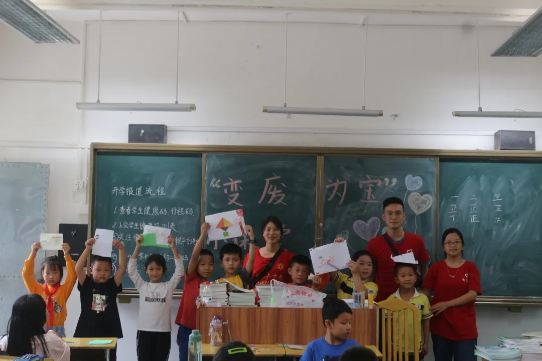 同时,在本次的三下乡的环保小课堂中,同学们被分为三个小组,进行了变废为宝的手工活动。在手工活动开展之前,志愿者对同学们进行变废为宝的相关环保知识讲解,激发同学们的兴趣和环保意识,之后按小组为单位分发剪刀、美工刀、双面胶、胶水、彩纸、彩铅和五张A4纸作为基本的工具材料,鼓励同学们利用身边的一些废品与垃圾进行一个新的创造与利用。