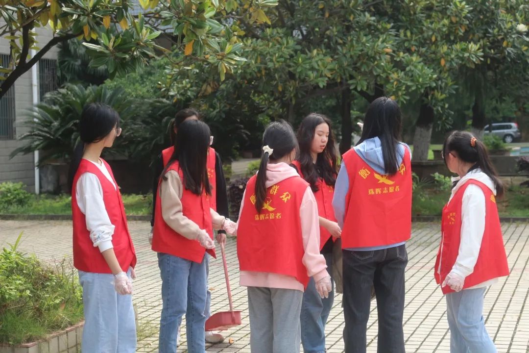 在书香四溢的图书馆前,党员志愿者带头践行社会公德,捡拾垃圾、捡烟头,清扫落叶等,有的拿着扫帚、有的戴着手套、有的拿着垃圾袋,大家打扫得十分细致,力求创造干净的学习环境。