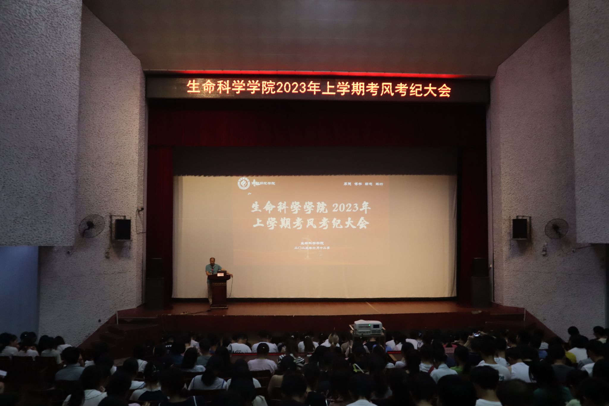 诚信是中华民族的传统美德,考试是对同学们平日学习情况以及诚信品质的集中检验,诚信考试是当代大学生义不容辞的职责,为引导学生遵守考试纪律,进一步营造公平、公正的良好考试环境,6月12日晚20:10,beat365官网于西校区排演厅召开2023年度上学期考风考纪大会,大会由学院党总支副书记陈雅斐主持,副院长杨海主讲,辅导员邓明智、曹海鸥、唐乾翔以及学院全体学生参加了此次会议。