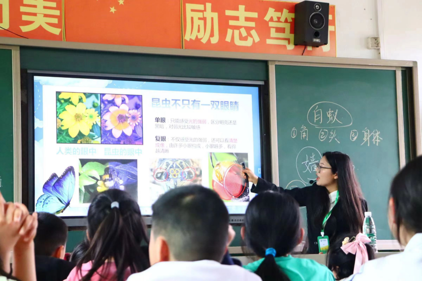 来自beat365在线唯一官网生物科学专业师范班谭颖嫱、向冬意、周婷、何洁美4名同学分别带领孩子们赴一场"与昆虫的约定",通过展示昆虫标本近距离给孩子们讲解昆虫结构、生活习性。这次公益课让孩子们对昆虫有了全新的认识,打开了孩子们认识昆虫世界的大门,也点燃了他们探索自然奥秘的星星之火。