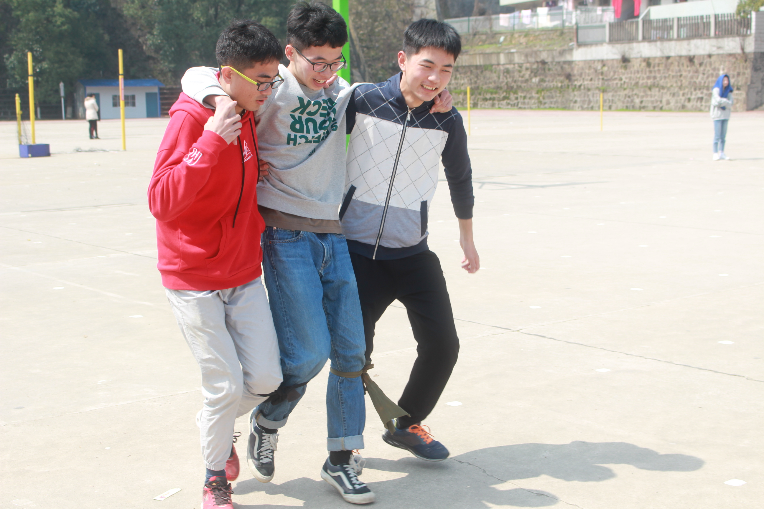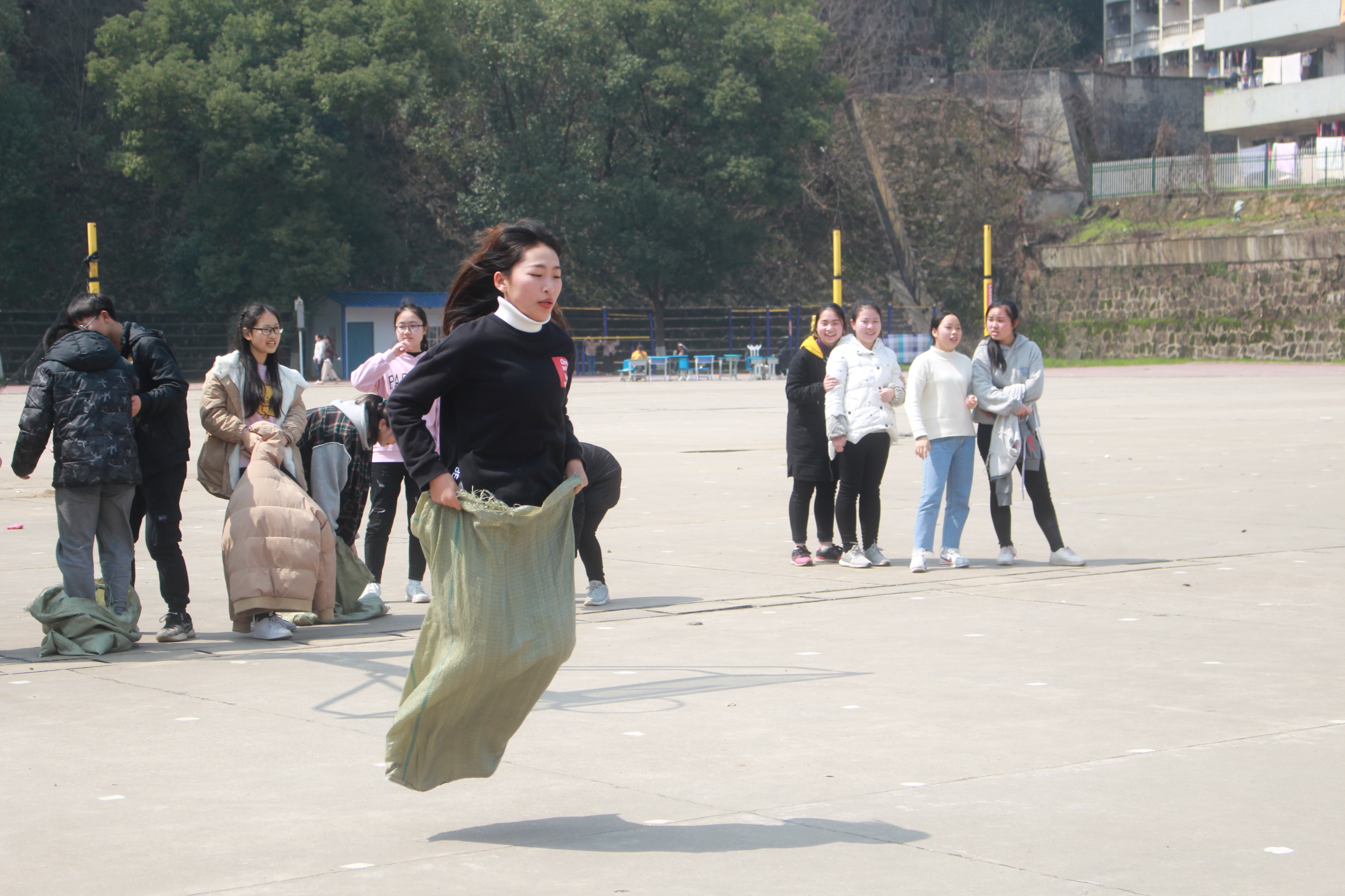 趣味运动会在3月11日中午继续传递热情。“一,二,一……”嘹亮的口号在赛场上回响着,“三人四足”,“袋鼠跳”等活动在场外观众高喊的欢呼声中愉快的结束了。