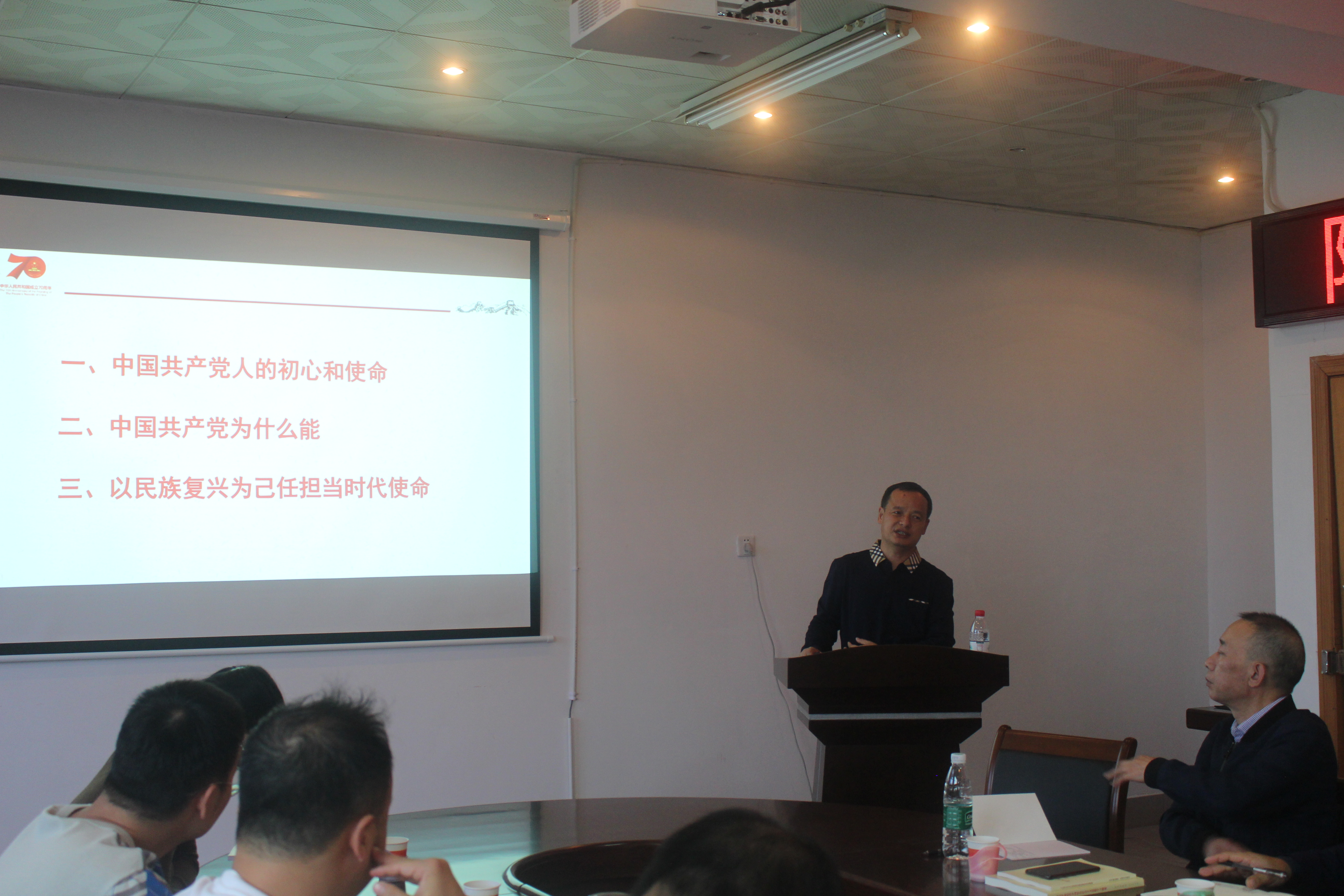 随后,他从“中国共产党人的初心和使命”、“中国共产党为什么‘能’”、“以民族复兴为己任担当时代使命”三个方面详细讲述,主题深刻,内容丰富。他提到,“为中国人民谋幸福,为中华民族谋复兴”的使命客观地落在中国共产党的身上。中国共产党成立后,在其领导下中国人民进行了一场场气壮山河的斗争,因而赢得了民族独立和人民解放。新中国成立后,在党的领导下国家经济实力与综合国力大幅跃升、人民生活水平极大改善、社会文明程度显著提高、国际地位空前提高。如今,70年的发展,在中华民族发展史上矗立起一座光彩熠熠的里程碑,以无可辩驳的事实证明了科学社会主义的强大生命力。