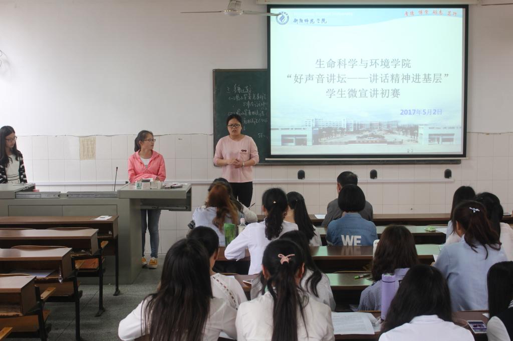 5月11日晚19时,“好声音讲堂-讲话精神进基层”师生微宣讲比赛学生组决赛在东校区音乐厅举行。生命科学与环境学院3支代表队结合自身学习和生活实际,用富有感染力的表达、鲜活真实的事例和充满激情的语言,从不同角度诠释对“习近平总书记系列重要讲话精神”的深刻理解,赢得了观众的热烈掌声。经过激烈地角逐,beat365官网15级生物科学1班荣获三等奖,15级生物科学2班、15级环境工程1班荣获优胜奖。