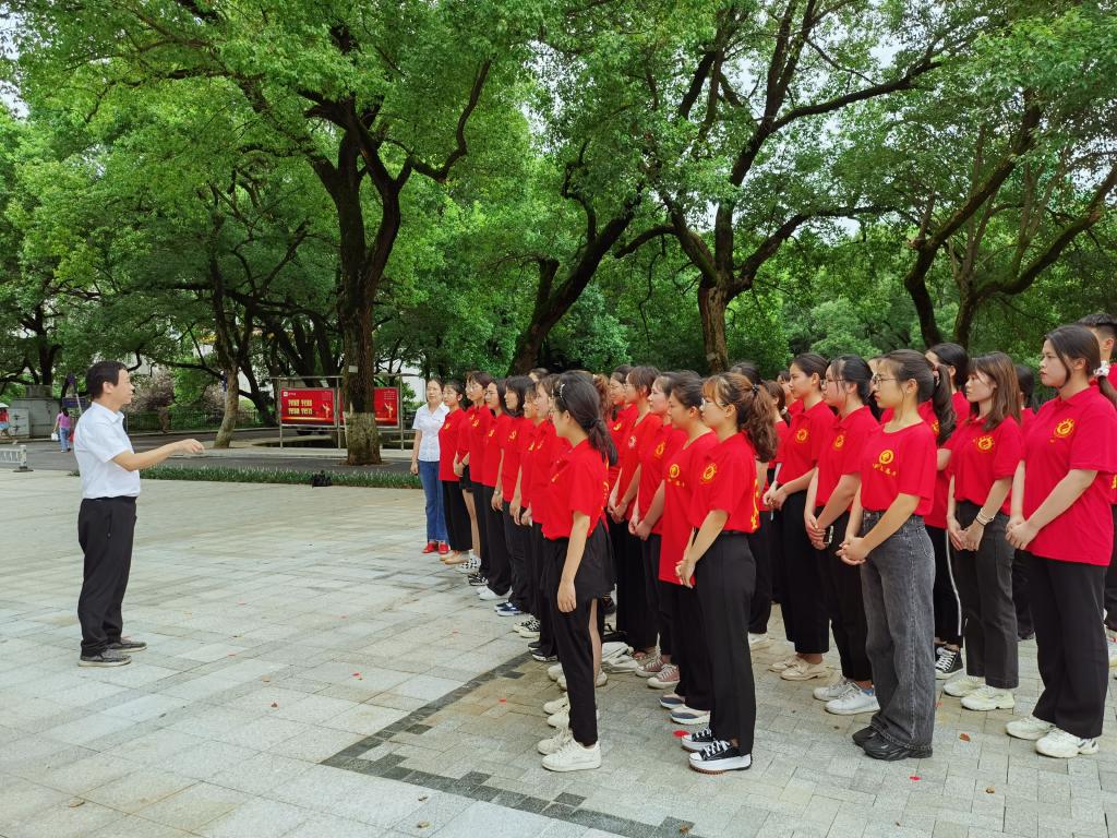 随后,学生党员罗佳欣带领全体新党员在湘南第一党支部--中共湖南省立三师支部历史陈列馆前的鲜红党旗下宣誓。列队肃立,大家举起右手齐肩握拳,跟随领誓人齐声宣誓,铿锵有力的发声表明了自己对党组织忠诚的赤诚决心。