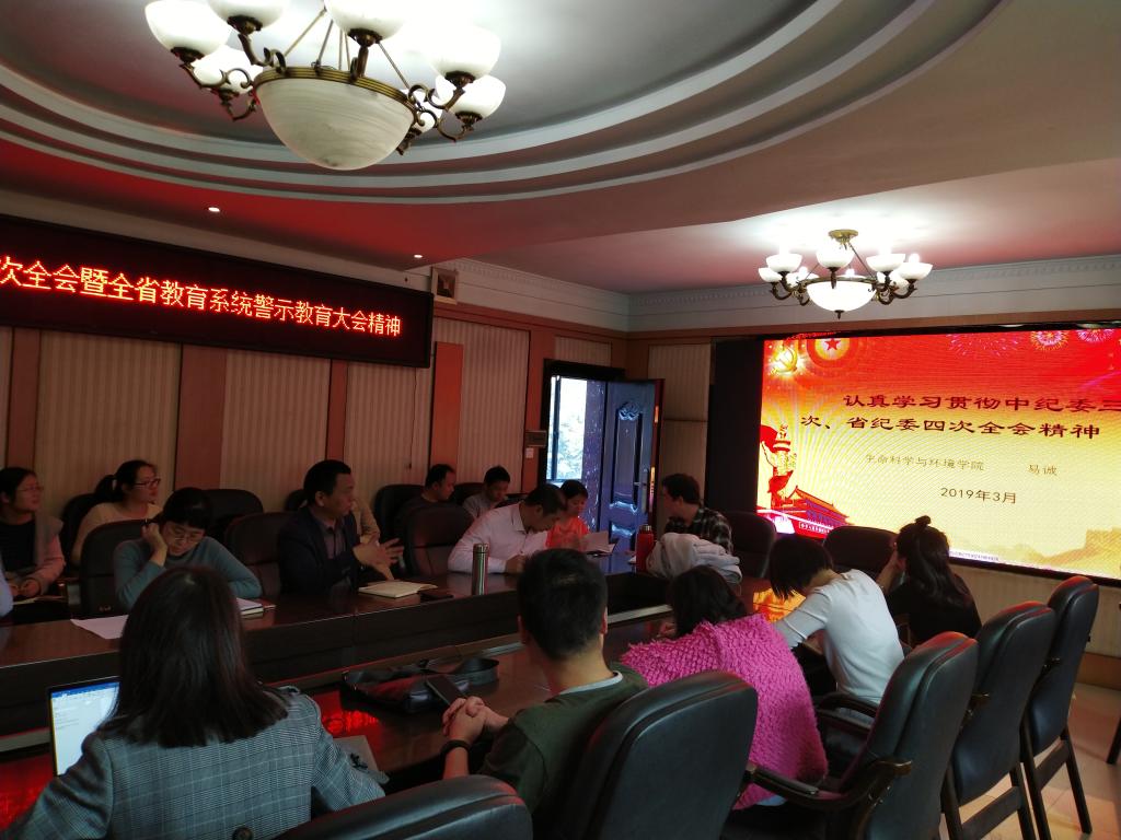 3月20日下午,生命科学与环境学院党总支组织全体教职工在西校区行政办公楼三楼会议室开展理论学习活动,学习主题为认真贯彻中纪委三次、省纪委四次全会暨全省教育系统警示教育大会精神,党总支书记刘艳波主持会议,副院长易诚兼总支纪检委员向全体教职工传达了大会精神。