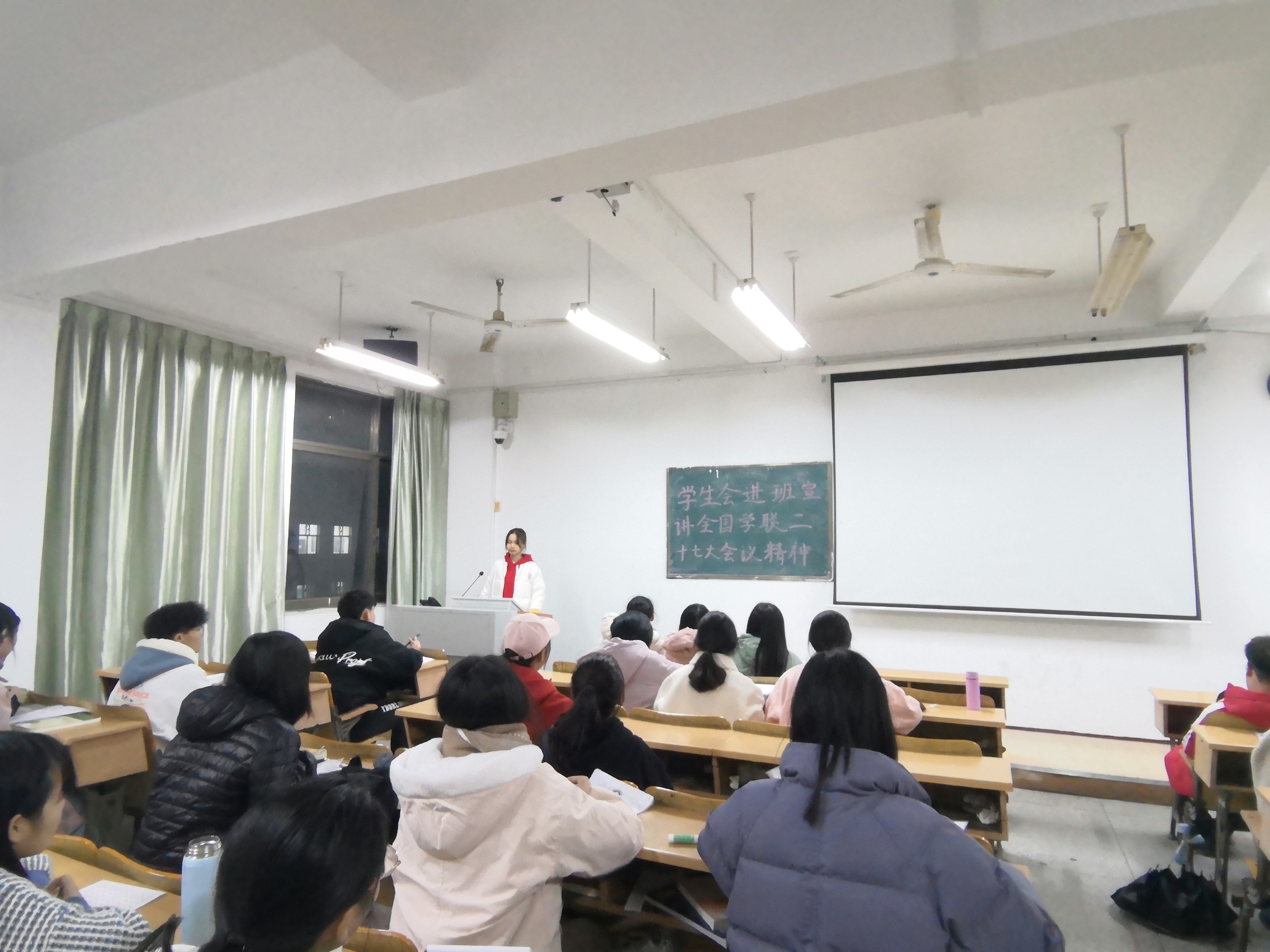 为深入学习贯彻全国学联二十七大、习近平总书记贺信和党中央致词精神,进一步凝心聚力、拼搏奋进,不断推进beat365官网学生会组织深化改革,11月24日晚19:00,beat365官网学生会成员进班宣讲学联二十七大会议精神,19、20级全体同学参与此次学习。